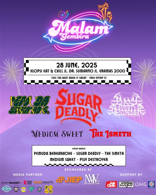 Dengan menghadirkan penampilan yang seru dari band-band muda, yaitu Sugar Deadly, PSSY Destroyer, The Ismeth, dan Medium Sweet dan Pemuda Berkaraoke, “line up yang akan mengisi di event musik malam gembira ini akan sangat meriah, terlebih lagi kita ada SUGAR DEADLY yang mempunyai fanbase tersendiri, itu akan sangat membuat para fans nya excited untuk menonton band kesayangan nya,” tambah Izzudin.